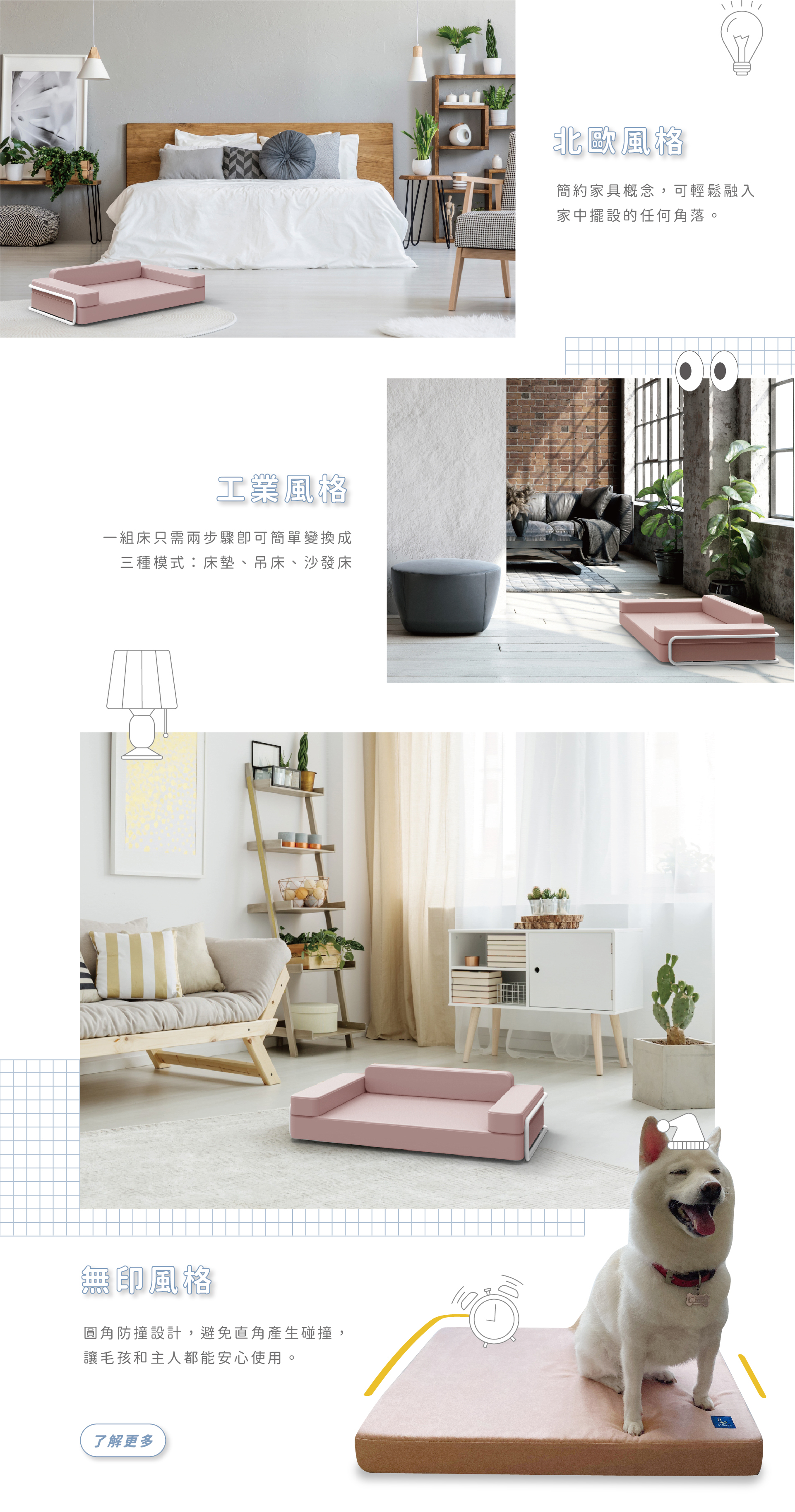 目前市面上獨家「多功能模組化」設計的台灣品牌寵物床,一組床只需兩步驟即可簡單變換成三種模式:床墊、吊床、沙發床。